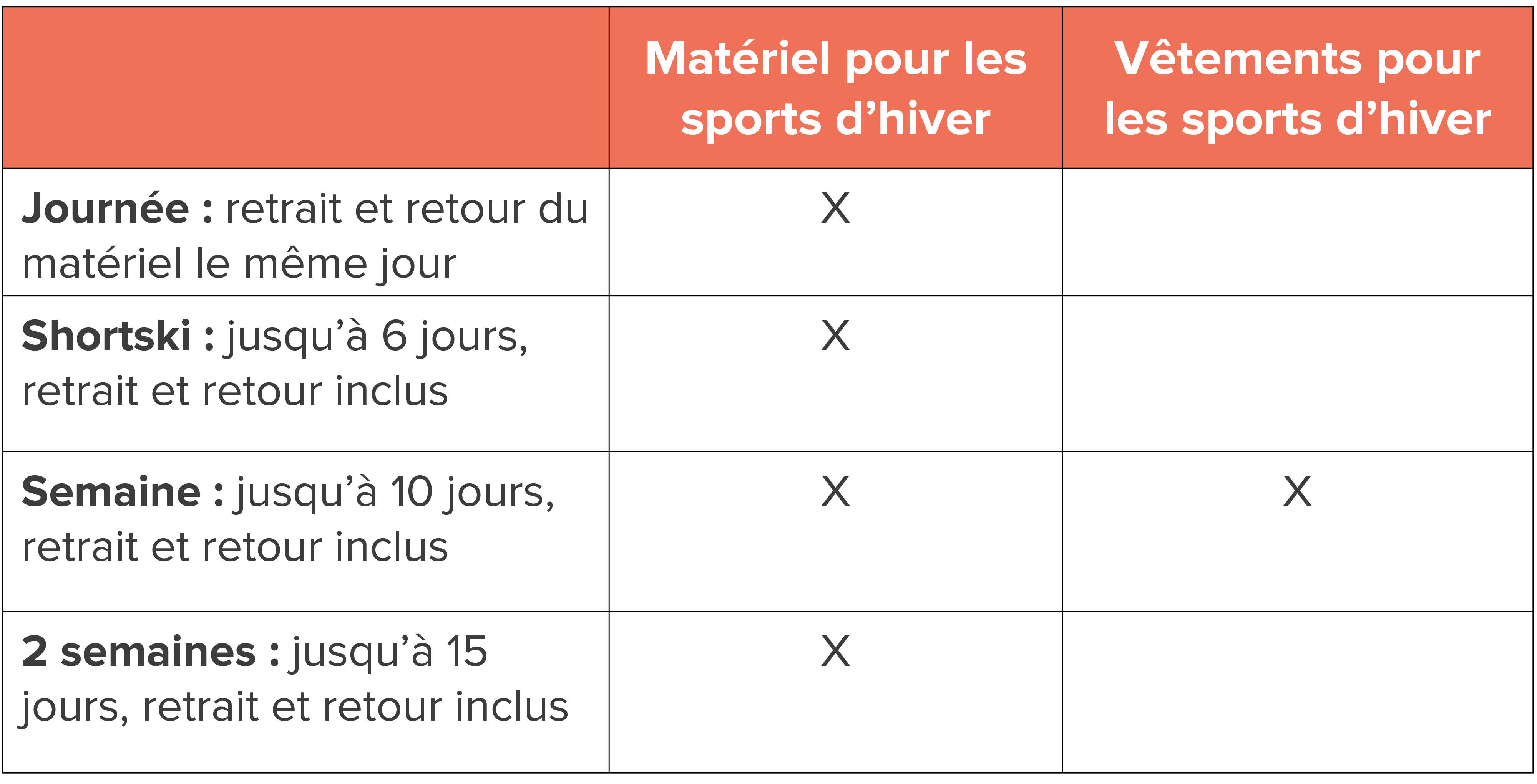 La durée de location standard des vêtements de sport d’hiver est d’une semaine complète. En réalité, vous bénéficiez même de votre tenue pendant 10 jours, ce qui signifie que vous pouvez venir la chercher un vendredi et la rendre le lundi. Pratique ! Pour le matériel de sports d’hiver, vous êtes entièrement libre de choisir la durée de location.