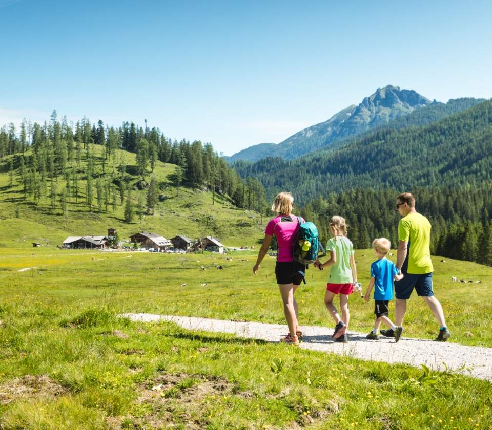 o Startpunt: aan de grote parkeerplaats in Gnadenalm