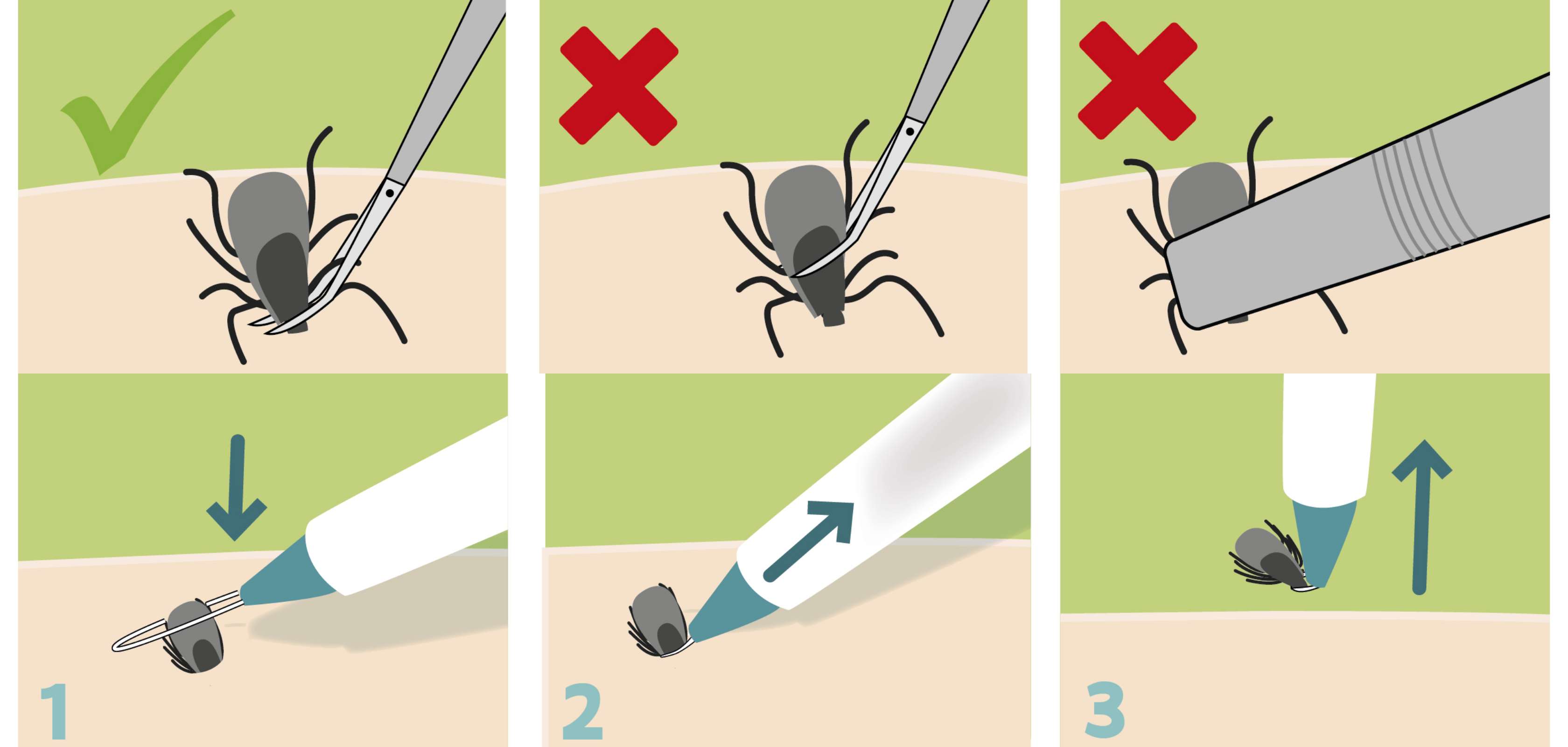 • Gebruik een tekentang of -pincet: plaats beide fijne punten van de tekentang om de steeksnuit van de teek heen. Dat is dus heel dicht tegen de huid aan. Druk de tang zachtjes in de huid en trek daarna rustig en in één keer de teek eruit. Maak geen draaiende beweging, maar een beetje wrikken kan soms nodig zijn. Grijp niet enkel het lijfje vast, want dan blijft de snuit steken en kan je de teek bovendien platknijpen.