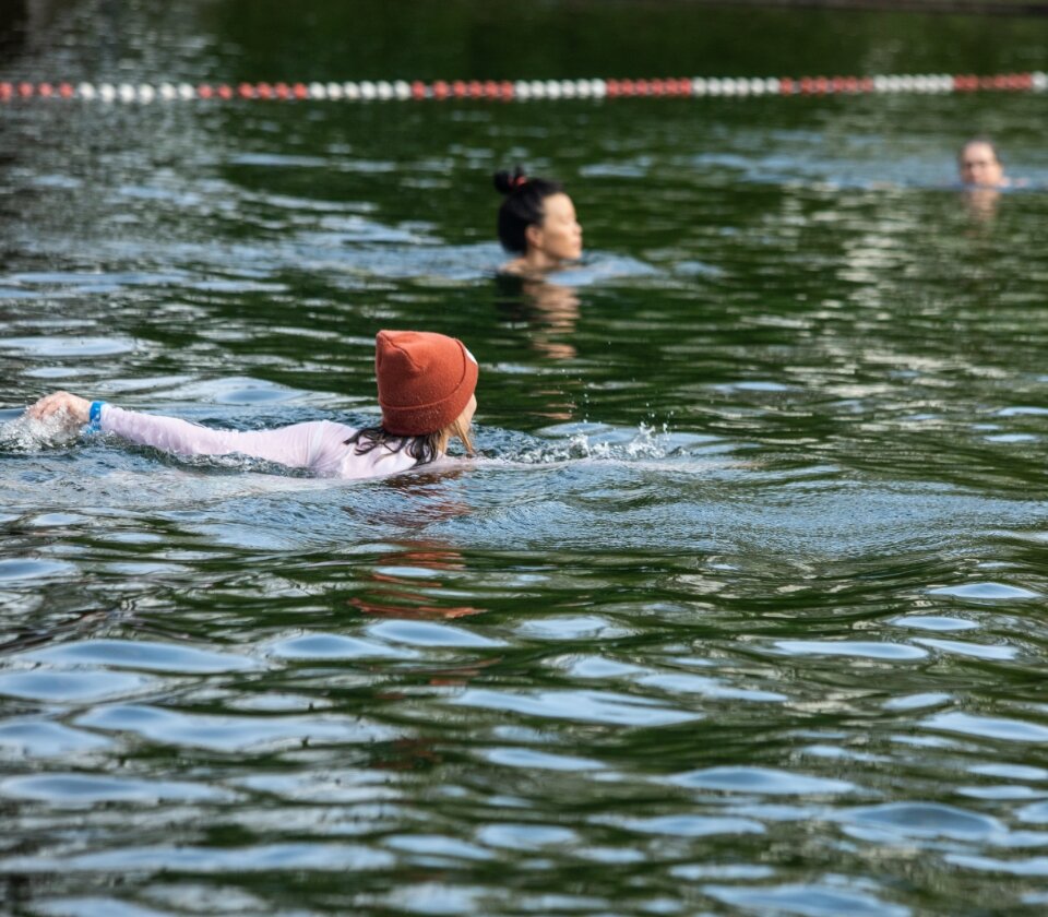 Hoewel Claudia samen met vrienden gaat ijsberen, omschrijft ze het als een individuele sport: “We warmen samen op, kleden ons uit, en dan laten we elkaars ritme los. Zij gaan sneller het water in, via het trapje, terwijl ik langzaam via een schuine zone het water inwandel. Je adem stokt door de koude, dus je moet je goed concentreren om je ademhaling onder controle te houden. Ik focus me volledig en sluit me mentaal af terwijl ik dat doe.”