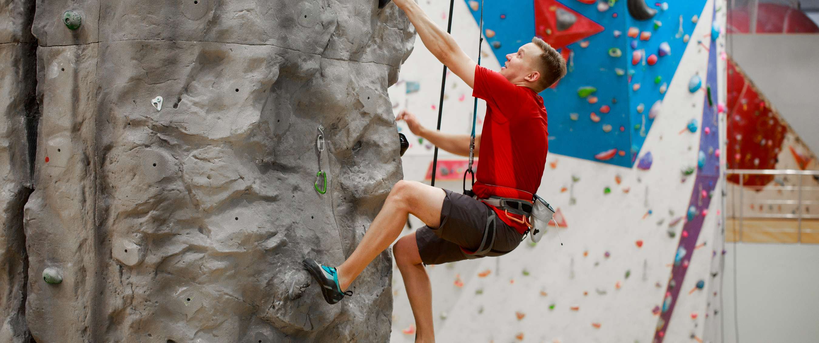• Klimschoenen: Met een rubberen zool voor optimale grip. Meestal zijn ze ook te huur bij de klimzaal. Zo’n schoenen zitten in het begin niet comfortabel – je teen zit tegen de voorkant - maar ze zetten zich naar je voet. Als ze echt comfortabel zitten, zijn ze wellicht te groot. Huur je schoenen? Neem dan een paar sokken mee.