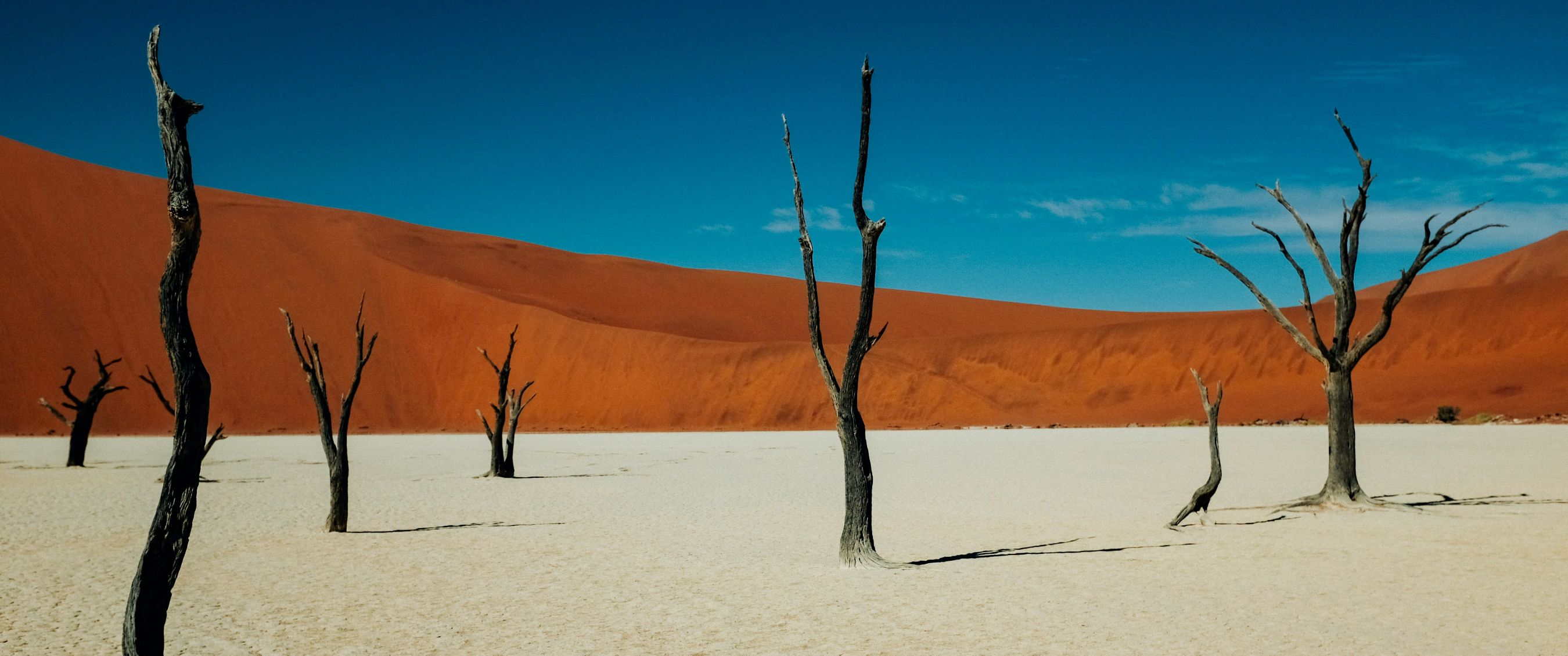 Niet veel verder in de Namib-woestijn vind je de Deadvlei (of Dodevlei), waar het lijkt alsof je in een kunstwerk van Salvador Dalí bent beland. Het surrealistische tafereel van de eeuwenoude dode bomen die afsteken tegen de witte kleipan, de vuurrode duinen en de blauwe lucht, blijft je gegarandeerd een leven lang bij. Een goede zonnebril is hier wel een must.