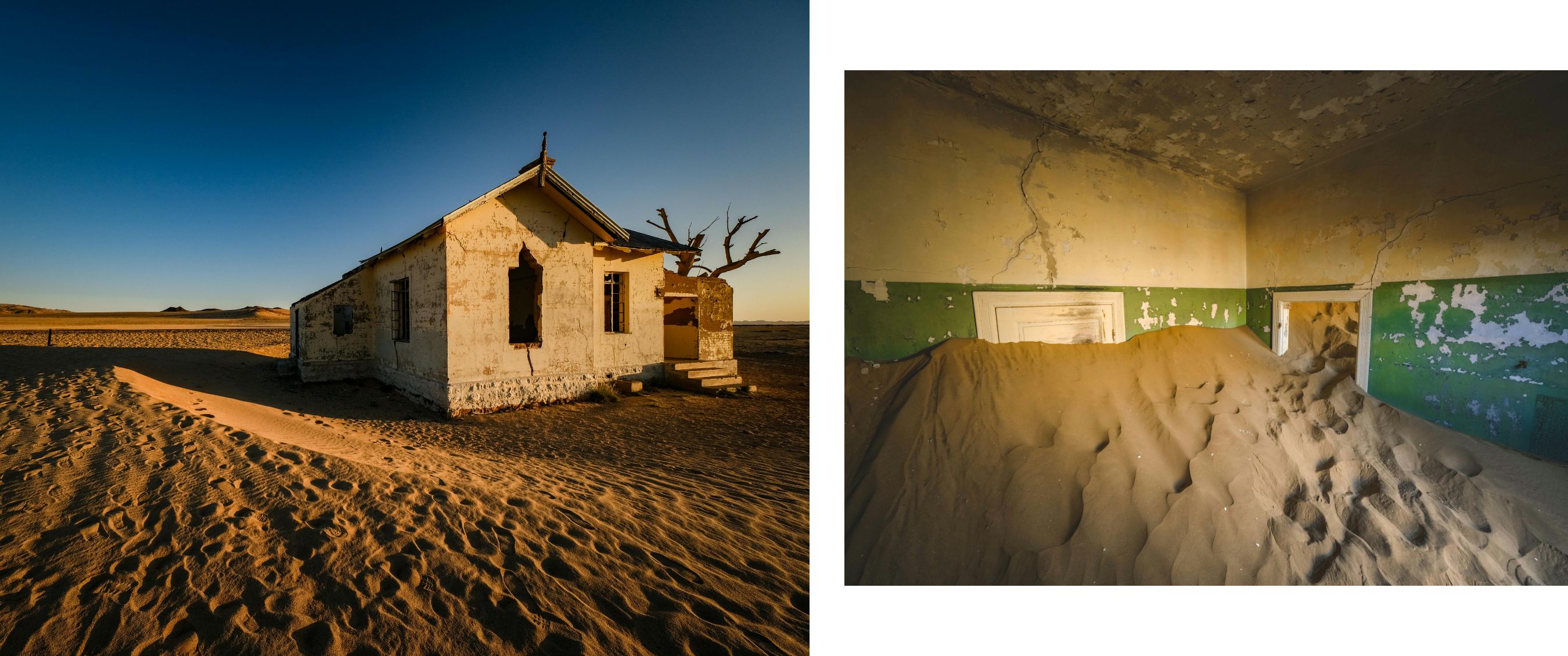 Kolmanskop wordt intussen langzaam maar zeker opgeslokt door de duinen van de woestijn. De ooit statige gebouwen zijn gevuld met zand, wat een surrealistisch beeld schept. Vandaag is het gebied beschermd en enkel toegankelijk via een georganiseerde tour. De koelere ochtenduren zijn het beste moment om alles vast te leggen op beeld (in het mooiste licht).