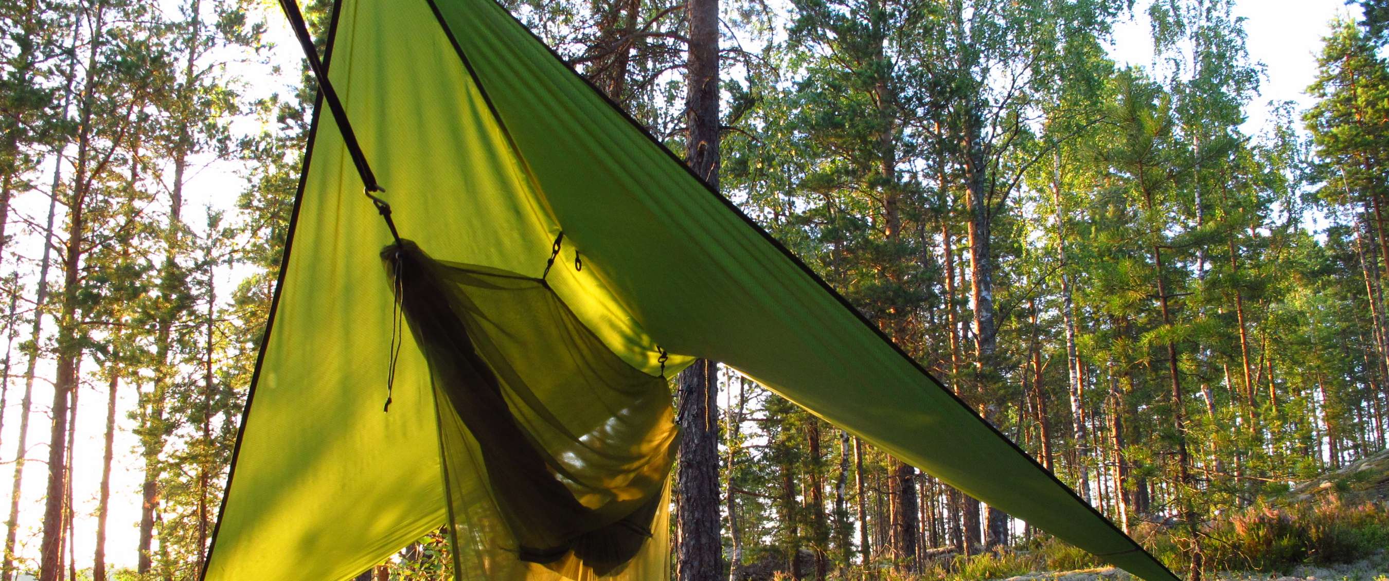 Bij veel wind plaats je hem best zo laag mogelijk tegen de grond, terwijl je hem bij windstilte als een lean-to shelter kan opzetten. In dat laatste geval span je hem op tussen twee punten in de omgeving, bijvoorbeeld tussen twee bomen.
